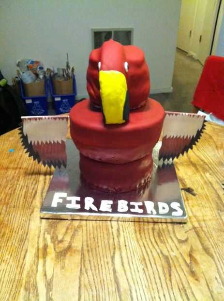 Rodó unas bolas más pequeñas de fondant en amarillo, negro y blanco para hacer los acentos en la cabeza de pájaro y le dio la capa roja unos minutos para instalarse antes de colocar las piezas de acento, Unidas otra vez con agua y pasta de goma. Durante el montaje final atacamos nuestro hipo más grande, que era que las alas de la pasta de azúcar eran demasiado pesadas para unir en los tacos y arrancó inmediatamente. Puesto que era ya de 4:00, improvisamos una solución mediocre de fotografiar nuestras alas de fondant, imprimirlos hacia fuera y colocar las alas de papel muy ligero a la torta. Si pudiéramos hacer todo otra vez, le diseñamos una estructura más sólida para las alas, tal vez de cartón, para mantenerlos contra la fuerza implacable de la gravedad.