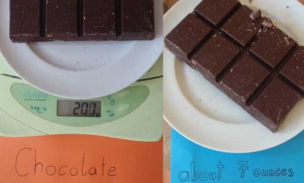 200 gramos o alrededor de 7 onzas de chocolate (si prefieres cacao que está muy bien también, pero recomiendo chocolate.)