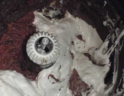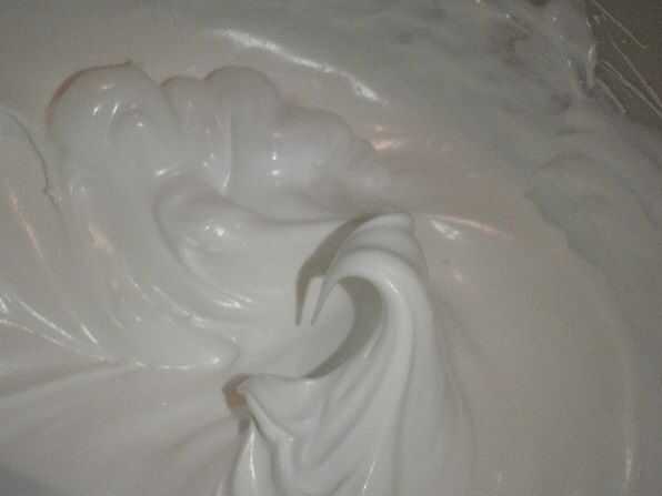 Ahora tenemos nuestro huevo otra vez. Con la batidora de mano golpearon hasta que son muy rígidas. Cuanto más usted conseguirlos, mejor. Si te equivocas a las claras de huevo y no consiguen tiesos, puede Agregar un poco de polvo para hornear a la masa. Una vez que el huevo duro bastante, atentamente fould en su masa.