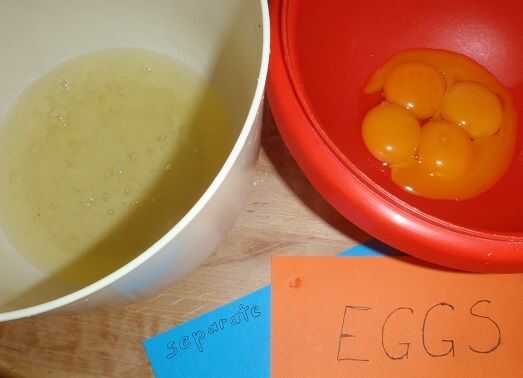Tomar el azúcar y poner la mitad en cada plato. (Así 1 taza a la yema de huevo y una taza a la clara del huevo)