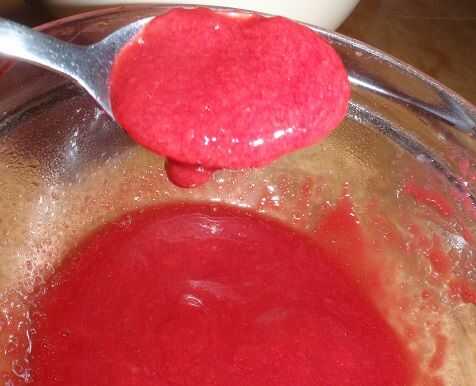 Poner las frambuesas en una olla y agregue agua. Dejarlo cocinar en la estufa hasta sus frambuesas son muy suaves y esponjosas. Vierta la mezcla en un tamiz (o paño) coloca en un recipiente. Utilice una cuchara o las manos para aplastar la mezcla por el tamiz (o paño) para separar las semillas de la fruta-materia. Hacer esto hasta que no sale más salsa. Añadir la salsa a la masa y mezclar hasta combinar.