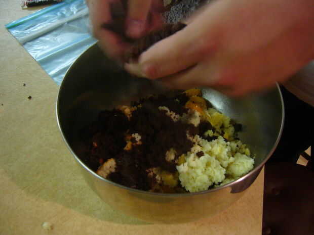 Una vez que las tortas se han enfriado a temperatura ambiente--o una temperatura tolerable, tomar mano completos y desmenuzar en un recipiente grande (suficientemente grande como para caber dos pasteles). No así a ambos pasteles en cuanto a mezclarlos uniformemente.