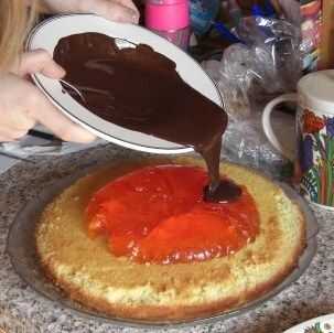 Dejar enfriar durante unos minutos, o inadvertidamente puede derretir la jalea al verter sobre la parte superior. Desde el centro de la gelatina, dejar la carrera chocolate y alisar sobre los lados del pastel con un cuchillo de paleta.