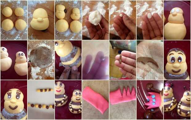 7. para los labios, hacer pequeños de fondant marrón y rosa. como hilo y pegar con agua.