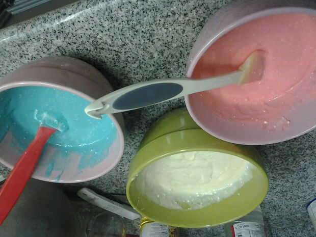 2 º los colores primarios son: dividir la masa en los tazones de fuente y color según sea necesario (mantener una gran cantidad de blanco le ayudará si usted Estimado mal)