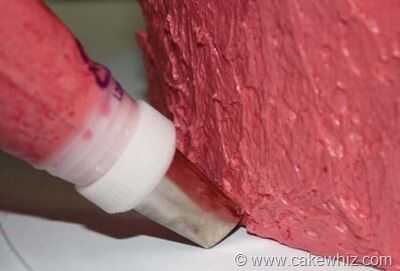 Llene una bolsa de hielo con glaseado rosa y coloque Wilton 104 (punta del pétalo). La punta tiene un extremo ancho y un extremo estrecho. El extremo ancho quede hacia el pastel y extremo estrecho debe ser mirando hacia usted.