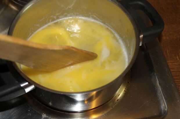Para la masa poner el agua a hervir en una olla pequeña la mantequilla o margarina. Cuando la ebullición y bien mezclado Retire la sartén del fuego