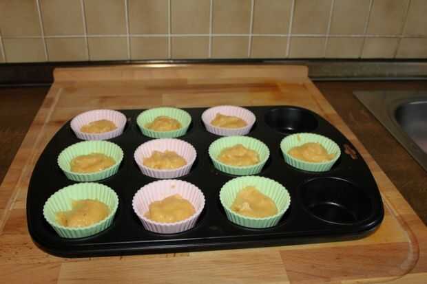 Cuchara y media sopera para cada taza. Mientras que de cocción esto se presenta como una torta de la taza de monstruo. No abra el horno hasta que esté cocida. Tarda unos 30-35 minutos para hornear. Si usted tiene una puerta de vidrio de su horno, podría ver el levantamiento de la torta de la taza de monstruo! Si no lo siento.. .please Compruebe la temperatura del horno.