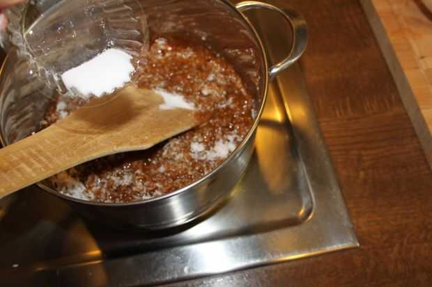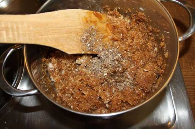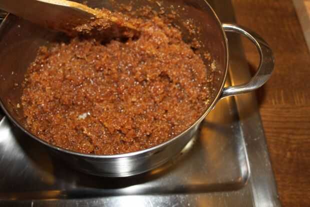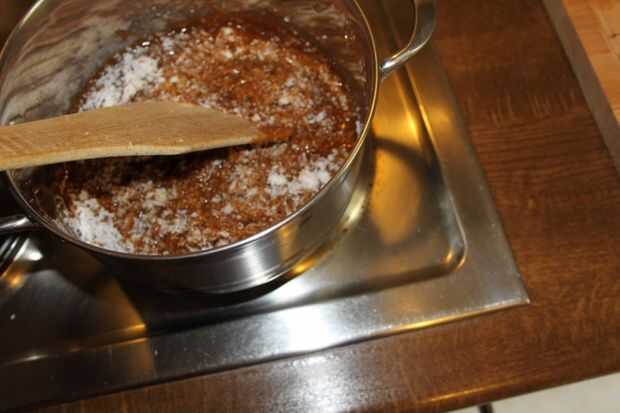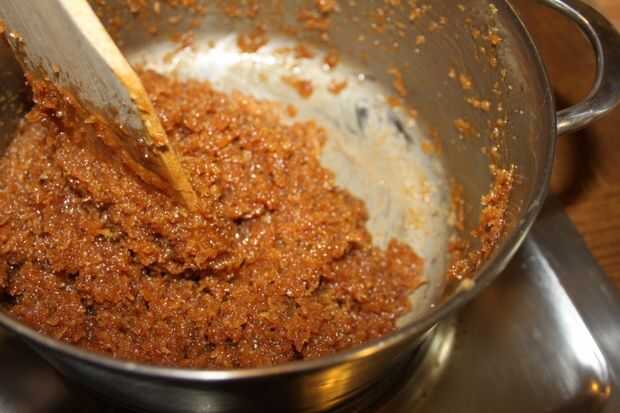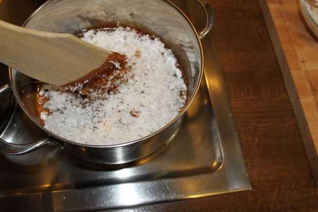 Ahora puse la panela en una olla y deje que se derrita lentamente a fuego lento. (Si usas miel o incluso suger no agregue agua). En este punto añadir el coco fresco mantenga revolviendo, añadir sal y cardamons. Seguir revolviendo hasta que se convierte en grueso y separado de los lados de la cacerola. Es igual si usas miel o azúcar. No deje sobre cook, entonces es difícil.