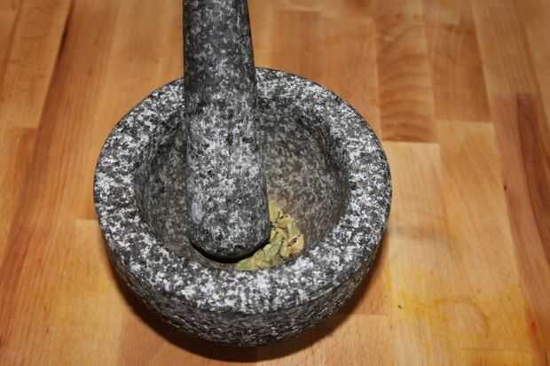 Utiliza mi molino de piedra para moler el cardamons de a pedacitos pequeños.