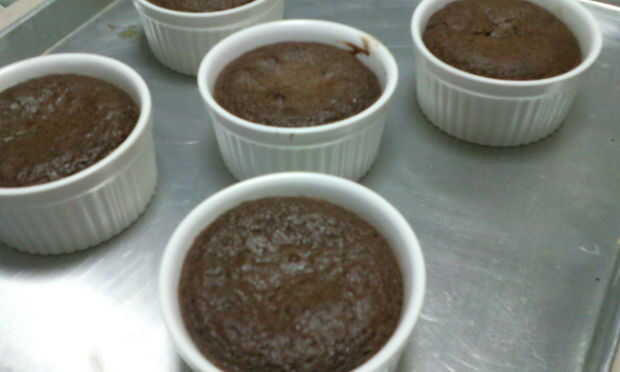 5. fondo y los lados de recipientes de mantequilla (horno prueba cuencos pequeños de vidrio/porcelana) y vierta en la mezcla unos 3/4 vías completo.