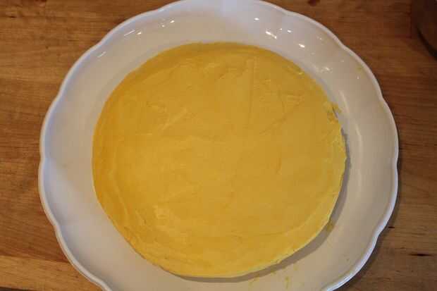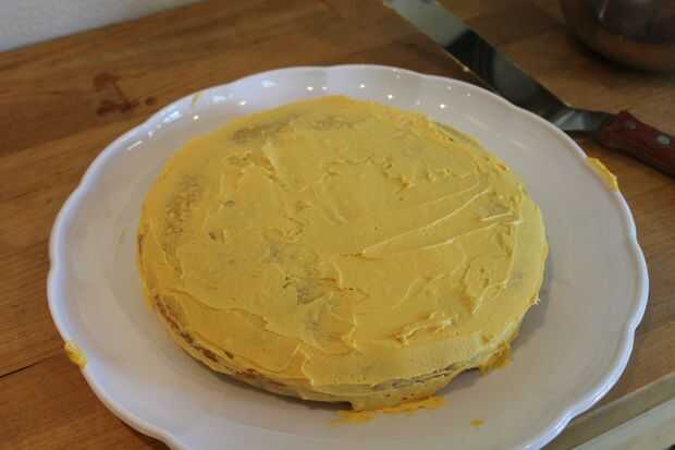Coloque con cuidado el pastel en un anillo de papel de pergamino a la derecha de la bandeja de servir para arriba. En primer lugar hacer una capa muy delgada de la cubierta, llamada la capa de 'miga'. Colocar en la nevera durante 20 minutos establecer la formación de hielo. Esto es sólo la primera capa.