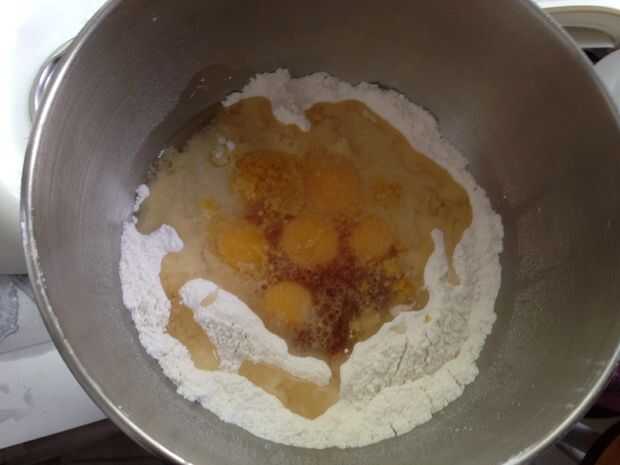 • Añadir aceite, yemas de huevo, agua, jugo de limón, ralladura de limón y la vainilla al pozo y luego batir hasta que quede suave.