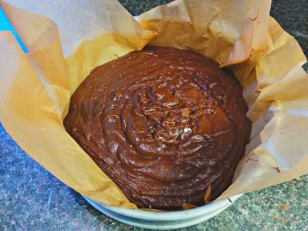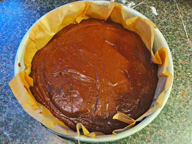 Llenar el molde para hornear redondo y corregir a su finlandés con la espátula. Puede cortar los bordes del papel de horno con unas tijeras.