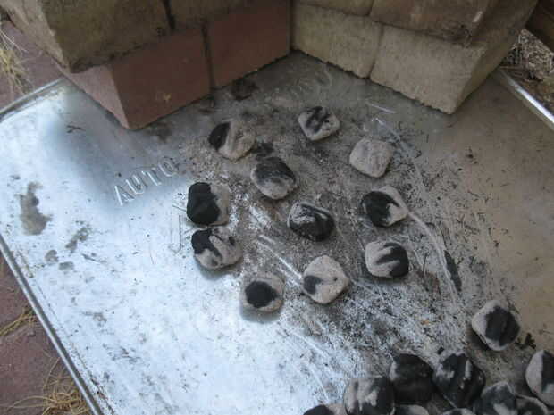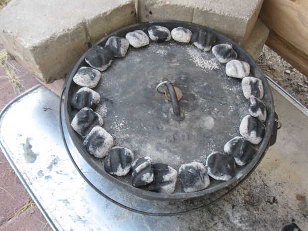Encontrar una agradable zona libre de escombros que podrían prenderse fuego. Utilizo una hoja de metal para proteger la tierra del fuego. Con carbón de leña encendido Coloque las briquetas de carbón 11 hacia abajo en un patrón circular. Coloque el horno encendido carbón de leña. Ahora coloque un anillo sólido carbón a lo largo del borde de la tapa. Esto debería darte 350 grados de calor. Utilice carbón extra si es un día ventoso o frío. Hornear durante 40 minutos.