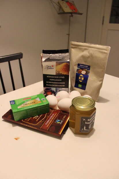 Ingredientes 200 g chocolate negro de comercio justo 200 g de mantequilla Feria de la panela 3 decilitros (sustituir 1 dl con miel oscura, si lo desea) 0,5 cucharadita de vainilla extracto (opcional) 5 huevos de corral