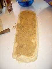 Mezcle 2 cucharadas de mantequilla derretida con la mezcla de azúcar morena-praliné (usted puede agregar sus propios ingredientes, como las nueces o higos) y se extendió uniformemente sobre el rectángulo. Desde el lado largo, la masa del rodillo y pellizcar los bordes para sellar.