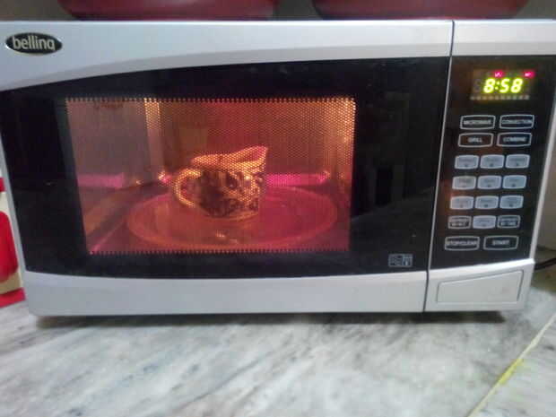 Microondas durante 1 minuto y 30 segundos. Si tienes menos de 1000W microondas pruebe un tiempo de cocción un poco más largo.