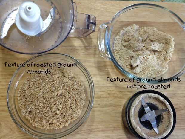 Es importante que usted asar las almendras. Como se ve aquí en la imagen no se tostado las almendras de tierra en el lado derecho. La harina no está bien y es pegajosa, el aceite de la nuez está todavía en las tuercas. Asar las almendras como se hizo en el lado izquierdo quita parte del aceite que permite la molienda de la almendra para ser una harina fina.