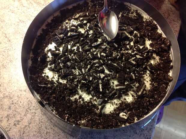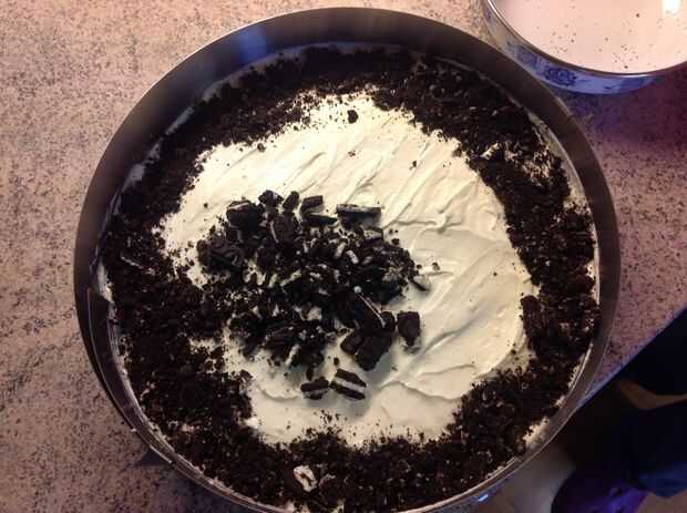 ¡ Yay! Casi se hace la torta. Ahora que tenemos que hacer, es colocar la crema blanca sobre el pastel e incluso hacia fuera con una espátula. Luego, tomar el martillado oreos y colocarlos alrededor de la torta. A continuación, tomar el corte oreos y coloque en el centro. Fijar más profundo en la crema utilizando una cuchara.