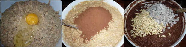 Agregar huevo, una pizca de sal y mezclar, añadir el cacao y mezcla, añadir sultana, piñones y mezclar.