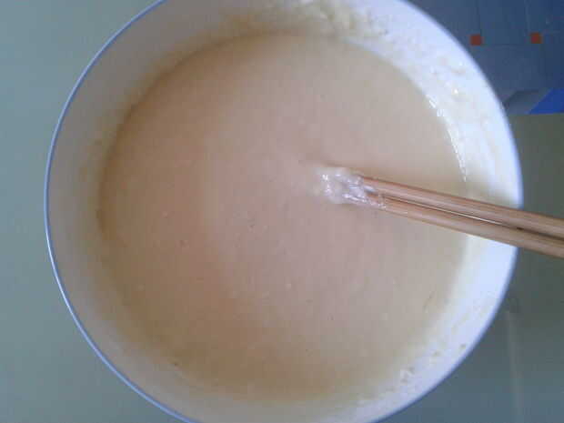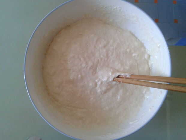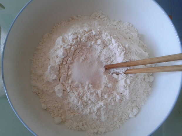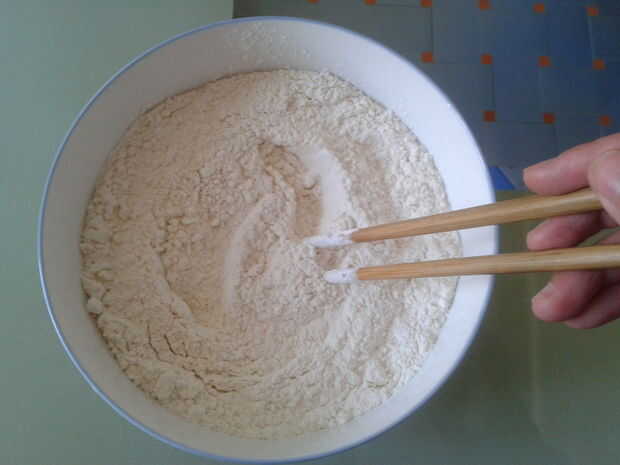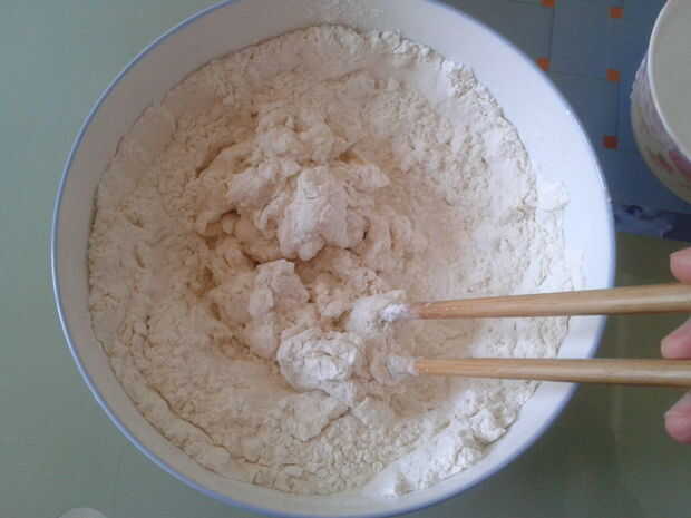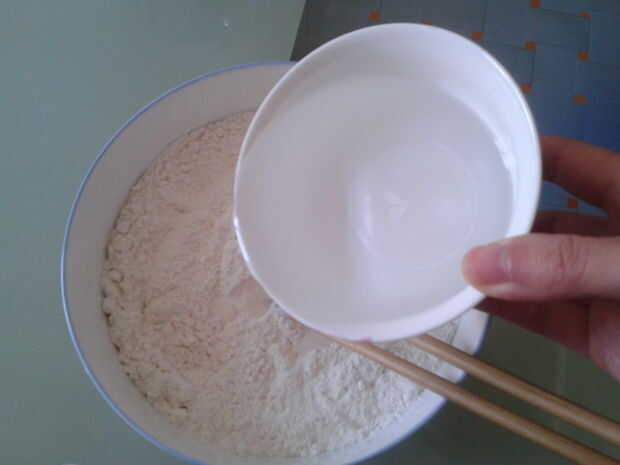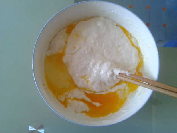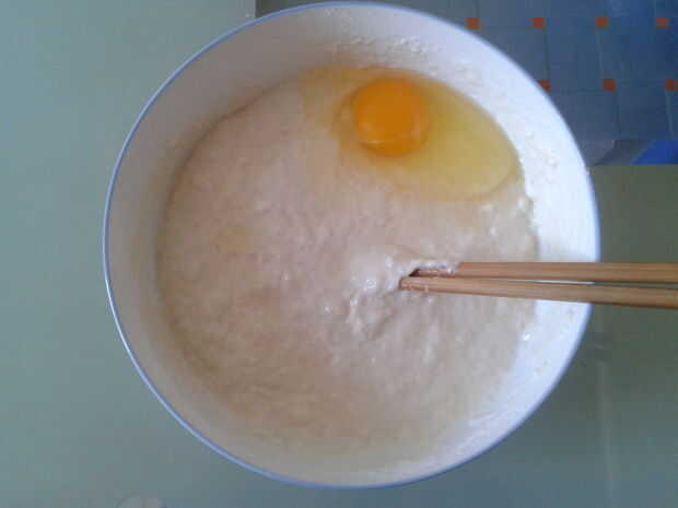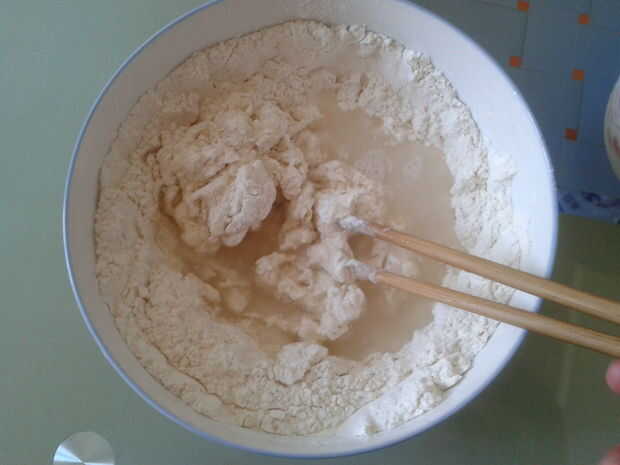 Combina la harina y la sal, añadiendo agua hasta hacer una masa. Luego, agregar el huevo en el y revuelva para mezclar bien. Tal vez veas que la masa no es muy suave, no importa ya que no es un final lo que vamos a utilizar. Lo fijó aparte, vamos a tratar con el Papa.