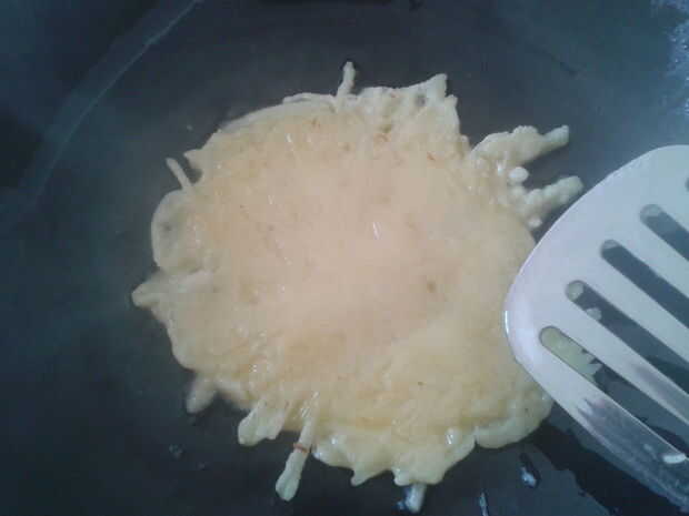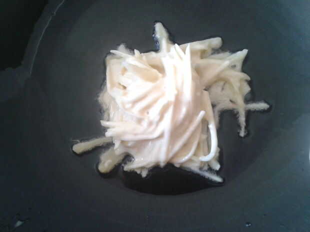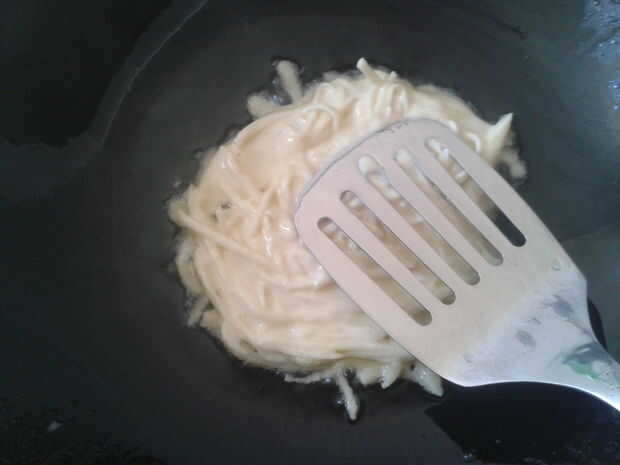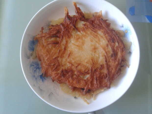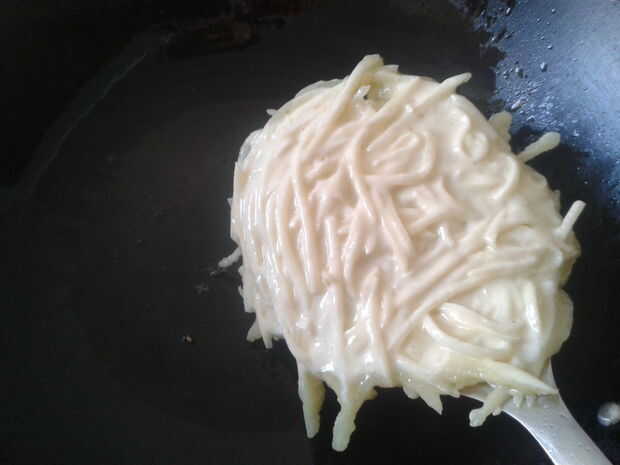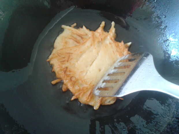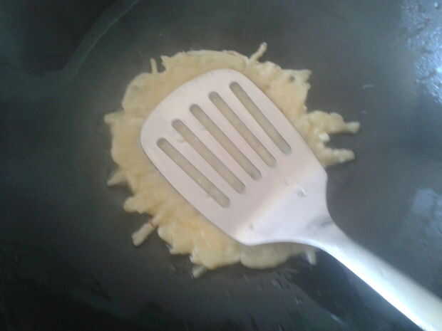 Calentar la sartén, poner aceite, pone la mezcla de patata de la mezcla. Durante la fritura, aplanar con una pala, hacerlo lentamente y trate de mantener cilíndrico si se puede, pero pasa nada si se convierte en una extraña forma. Darle la vuelta, continuamos aplane con la pala. Repetir y repetir hasta dorado pálido.