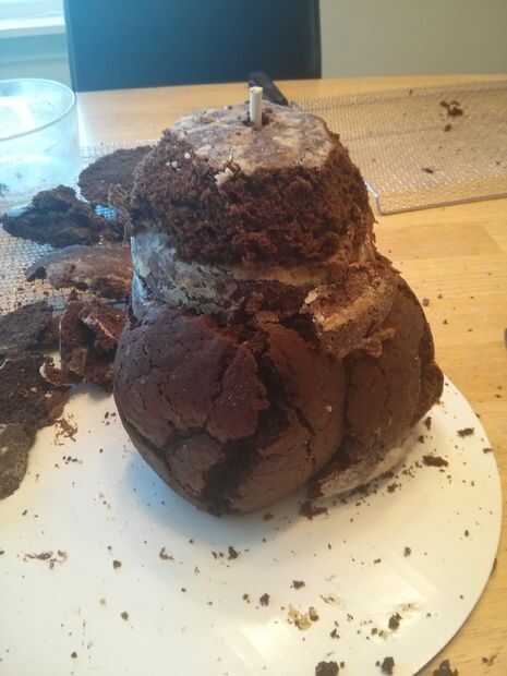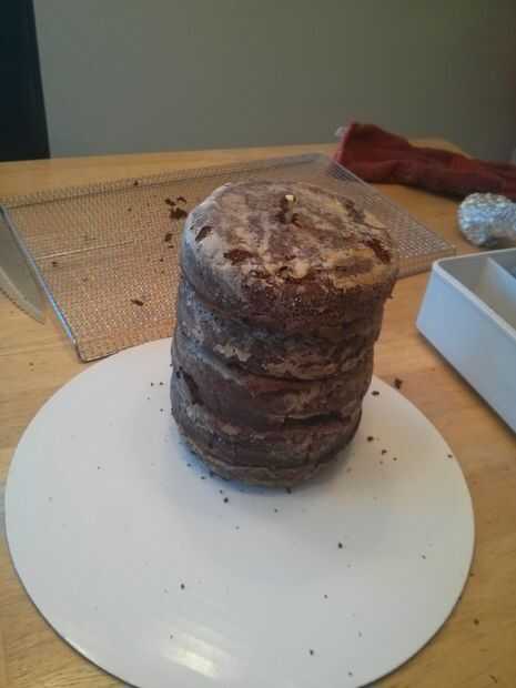 Sus tortas con formación de hielo entre las capas de la pila y pegue el pasador a través de él. No necesitais un taco para tortas como esta pero prefiero estar seguro que lamentarlo. Nada sería más aplastante que la caída de su creación ser un minúsculo pedazo de madera.