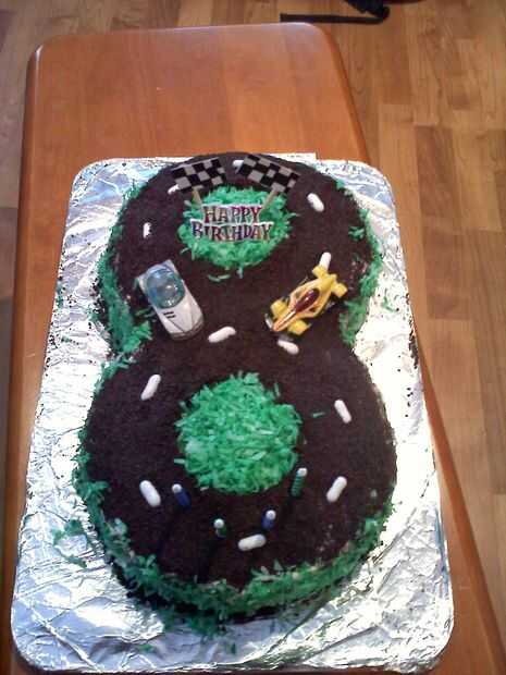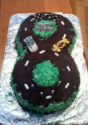 Esta fue mi primera torta decoración proyecto - para el cumpleaños 4 de mi hijo. Ama los coches y camiones así que hice este pastel de figura 8 pista súper fácil. ¡ ENCANTÓ!