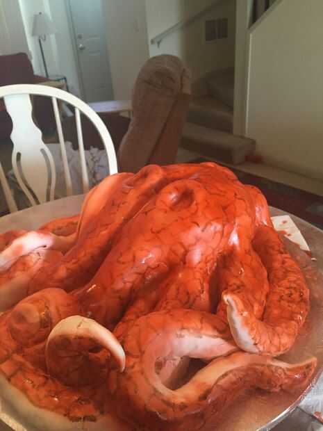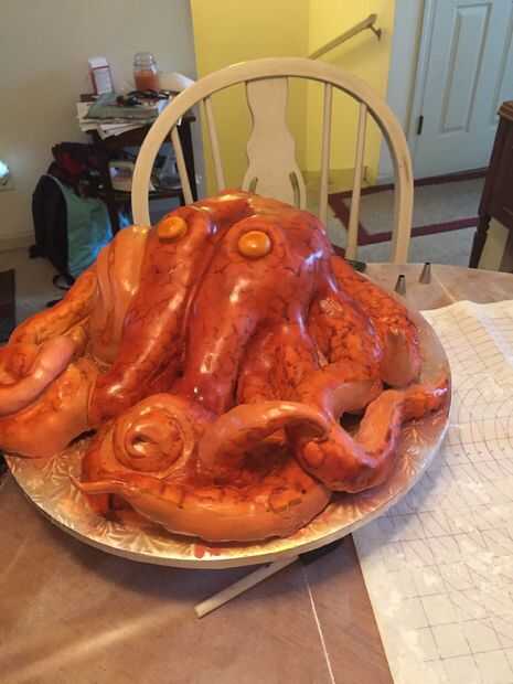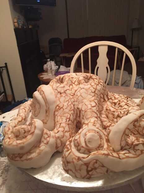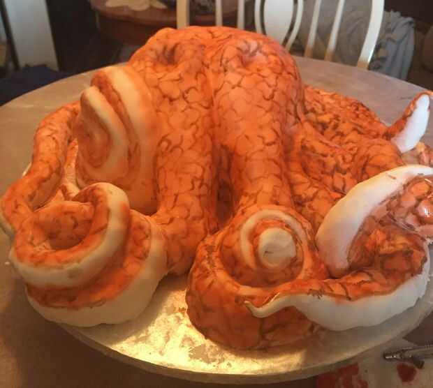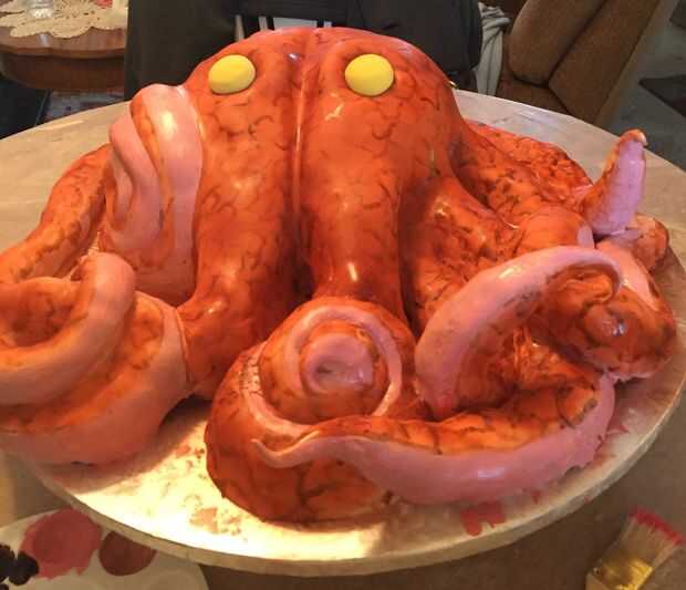 Para hacer los ojos teñidos algunas fondant amarillo y había hecho dos bolas y había pegado con pegamento comestible. Yo también con el marrón amarillo que hice para el pulpo entero intentando realmente destacar los bordes aerografiado.