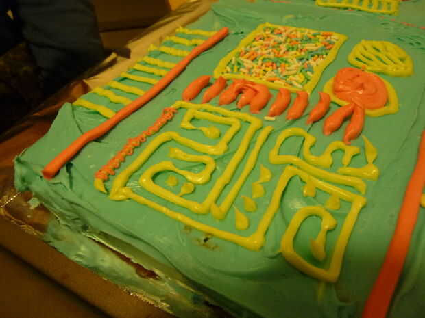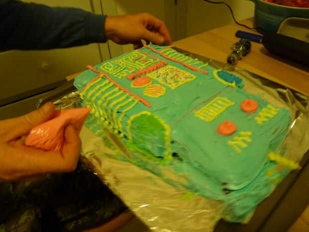 Poner el glaseado de color de acento en bolsas ziploc, cerrar y cortar un pequeño pedazo de la esquina para hacer una manga pastelera casera. Ir a la ciudad en el pastel, hicimos algunos circuitos, botones al azar, de tuberías, una cara de robot, etc.. Una sola vela actúa como una antena en la cabeza. Nombramos nuestro robot según las iniciales y la edad del cumpleañero, el MD25. Como se puede ver, le complacía.