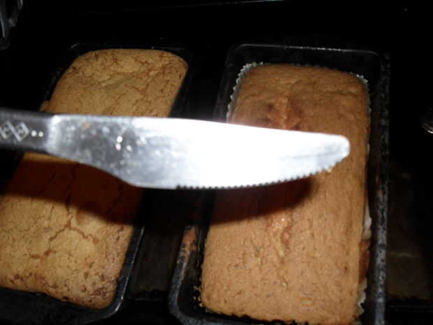 Ahora, cuando tus pasteles han aumentado y han pasado un agradable color dorado, lo que quieres hacer es agarrar un cuchillo para probar para ver si está cocinado a través de todo el camino...