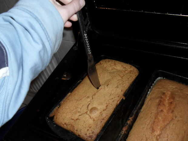 Elegir un lugar en alguna parte en medio de la torta y empuje su cuchillo en el y saque (un poco como si usted donde comprobar el aceite en tu coche) si el cuchillo sale con mezcla de torta húmeda en él... Necesita más tiempo en el horno... Si sale 'seco', entonces su tiempo a los beautys en un enfriamiento del estante o limpiar towl de té