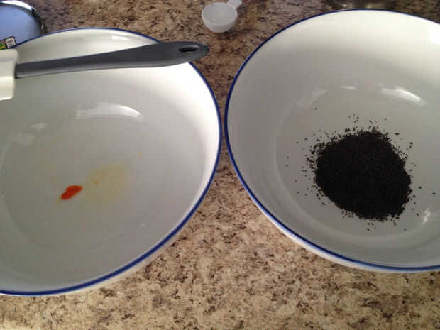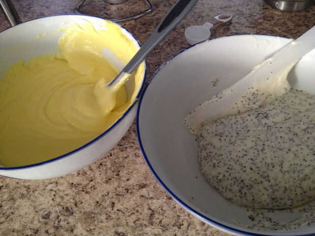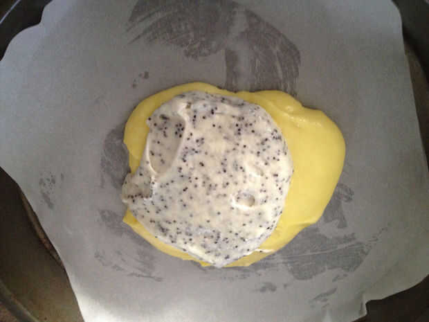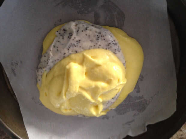 En una cacerola, drop cantidad de amarillo, luego cubra con la cantidad de semillas de amapola, luego amarillo otra vez, y semillas de amapola otra vez. Están creando una cebra como torta.