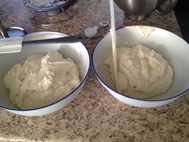 Preparar dos 9 pulgadas redondo pan con grasa y luego con papel de pergamino y engrasar nuevamente.