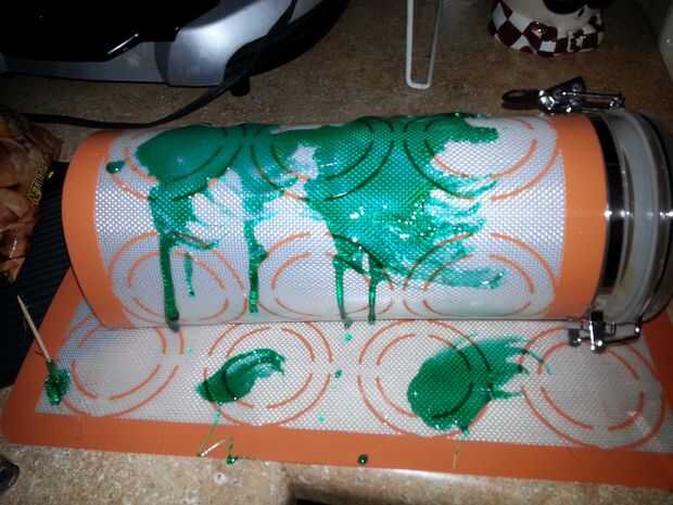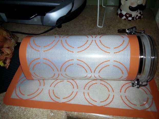 Colocar una alfombrilla de silicona grande y luego la cinta otra alfombra alrededor de un ~ 6" redondo cilindro de algún tipo. Ponga el cilindro envuelto en la estera de la silicona con la costura hacia abajo.