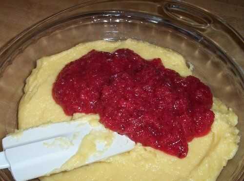 Una vez en la sartén la mezcla básica, agregar sobre una taza o menos de su sobra salsa de arándano y luego ligeramente doblar, por lo que es de mármol. No mezclarlo completamente.