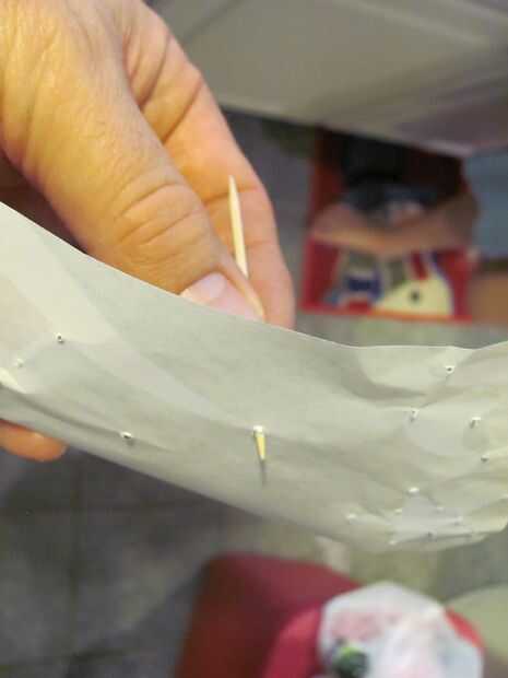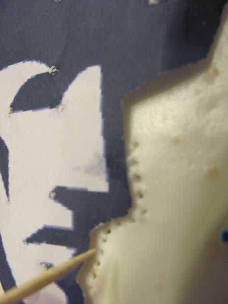 Meter el palillo hacia atrás a través de los agujeros que has hecho para convertir estos lugares en el glaseado. Además de los detalles interiores es una buena idea para ir alrededor del perímetro y completamente trazar el contorno de la imagen con pokes de palillo de dientes en el glaseado.