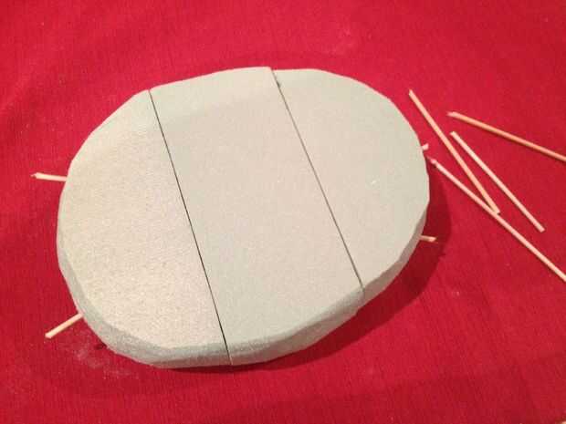 Me quedé pinchos a lo largo de las piezas, para mantenerlos juntos como una sola pieza, en última instancia. Decidí ir en diferentes direcciones para causar variación para un mejor agarre. Palo de los pinchos en la mayoría de la manera, romper con cuidado y dejar un pequeño trozo al final. He utilizado un martillo para eliminar el exceso y empujar en la espuma del resto del camino.