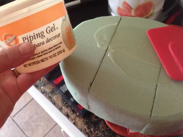 Ahora, si tienes un pastel, puede dar una ligera capa de hielo, o una capa de"migas" creo. Pero en este caso, utilicé una espátula y piping gel - un pegamento transparente pegajosa, comestible, para ayudar a que el fondant se adhiere en el paso siguiente.