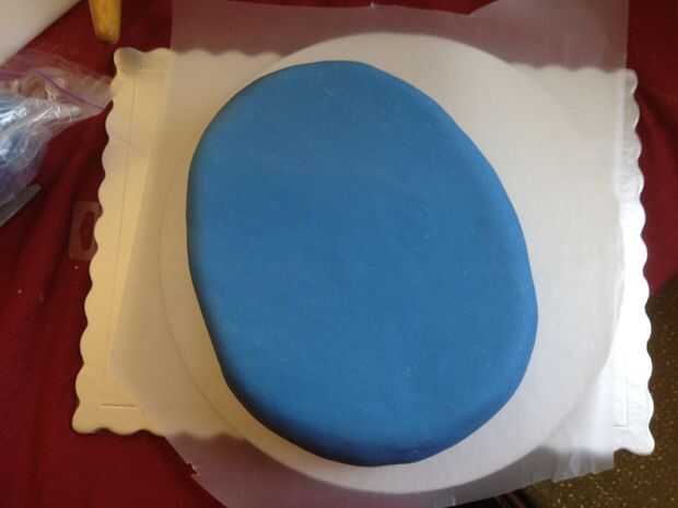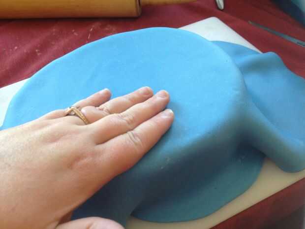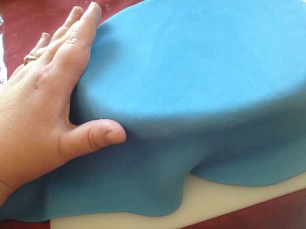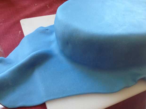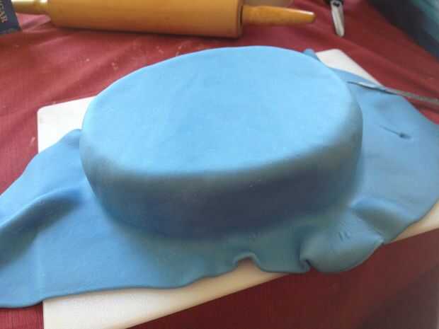 Cuidadosamente transferir su fondant para tu pastel, utilizar dedos suaves para presionar y alisar hacia fuera la parte superior, ningunas burbujas de aire!!! Luego a pie su camino por el borde de la torta en la parte superior, recorrer, el camino inferior del borde y caminar alrededor. Tienes que ir poquito, por poquito, todo el camino alrededor. No pase o usted será capturado en algunos pliegues desagradables y se arruinara tu fondant.