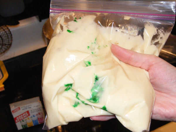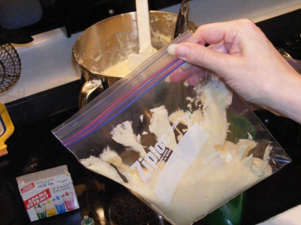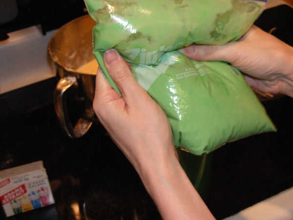 Encontrar un vaso o recipiente que quepa un bolso ziplock de sandwich. Voltear el borde hacia afuera. Separar la masa igualmente, debe trabajar alrededor de 1/2 a 1 taza. Agregar colorante, cerca y amasar para mezclar.