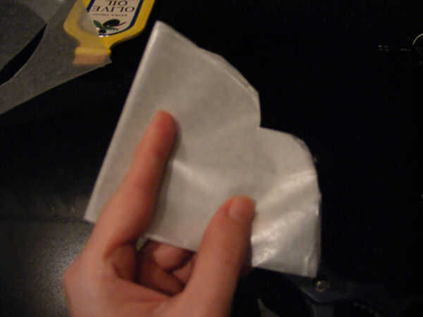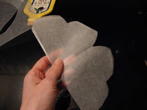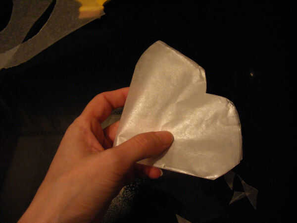 Doblar el círculo resultante en cuartos, cortar una inmersión en el medio y los cantos. Se verá un poco como un corazón. Desdoble y coloque la plantilla sobre las tortas.