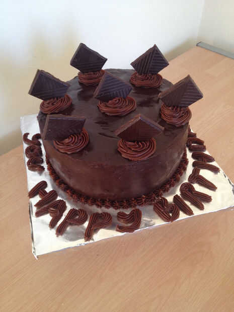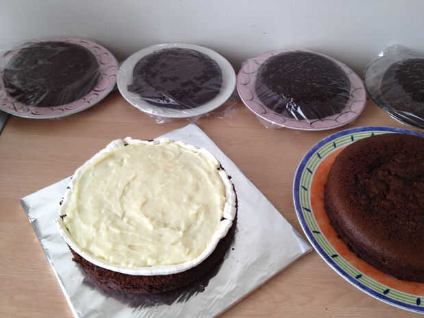 Coloque una capa de pastel sobre el tablero de la torta, algunos rellenos de trufa de propagación. Tapa con la otra torta, con relleno de trufa, después tapa con la última torta.