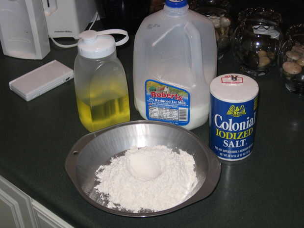 Esta es una manera muy vieja, muy fácil para hacer una tarta. No hace la corteza mejor hacia fuera allí, pero es perfectamente útil y fácil de limpiar de. En primer lugar, juntar todos los ingredientes y volcar toda la harina en la sartén. Crear un bien en ella y cada cosa en el pozo de la descarga.