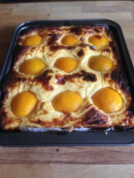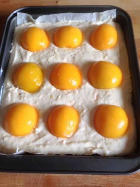 Perfectamente disponer las mitades de durazno con los lados redondeados hacia arriba y hornear durante unos 35 minutos. ¡ uy! Me había puesto la bandeja en el estante superior, y consiguió un poco quemada. Ninguna queja es aún sabroso. ¿MMM no se parecen huevos fritos en la torta?