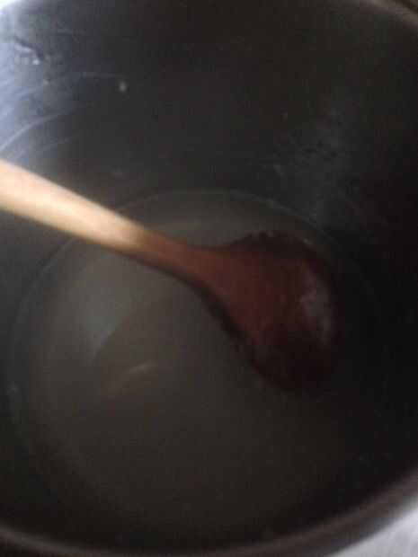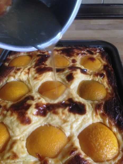 Superior hasta el jugo de durazno con agua hasta completar 500 ml. La raíz de la flecha con un poco de mezcla del líquido, luego agregue el resto del líquido. Añada azúcar a ebullición y hervir durante un minuto hasta que esté transparente y pegajosa gruesa. Cuando cool vierta sobre los melocotones la torta y dejar establecer.