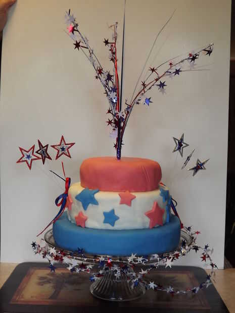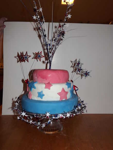 Cuidadosamente transferir la torta a un soporte de la torta y decorar con adornos restantes a cada lado de la torta, así como la parte inferior del soporte de la torta.