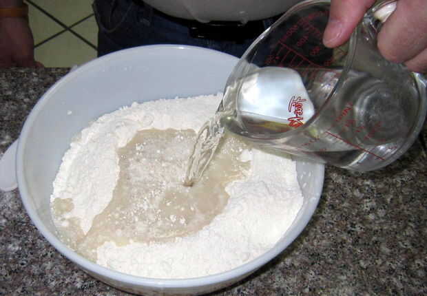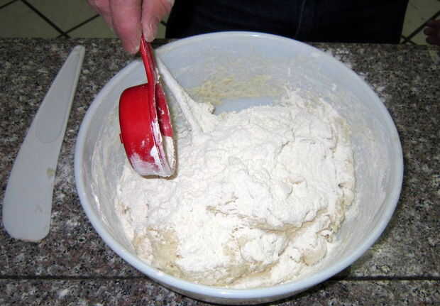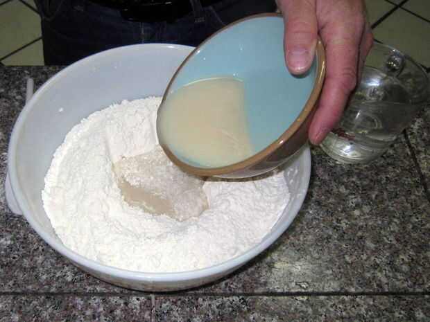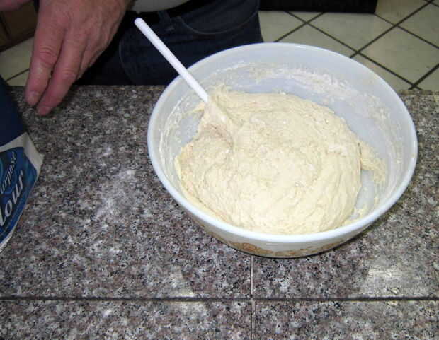 En un bol grande mezclar la mezcla de pastel con 3 tazas de la harina. Una vez que tengas todo mezclado hacer un pozo en el centro y vierta la mezcla de levadura en el pozo. Añadir la otra taza de agua tibia. Ahora mezclarlo todo para combinarlos. Esto un montón más fácil si tienes una batidora con una masa del gancho pero hemos mostrado aquí que usted puede hacer todo a mano. Añadir la harina restante, alrededor de 1/2 taza a la vez, revolviendo bien después de cada adición hasta que la masa se desprenda de la taza al mover la cuchara.