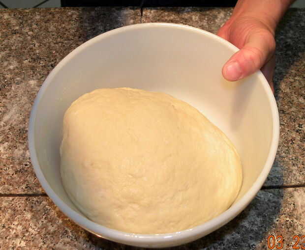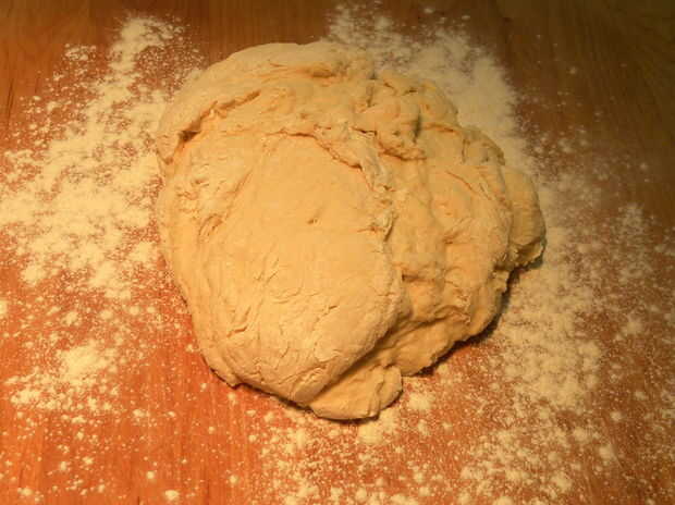 Gire la masa una superficie enharinada y amase hasta que su suave y elástico. Amasar significa con las palmas de las manos y trabajando desde el pulsador del centro la masa plana en todas las direcciones. Una vez que tengas lo aplana hacia fuera en un gran círculo pliega en tercios y después aplanar detrás hacia fuera otra vez. Seguir haciendo eso hasta que, como dije, su suave y elástico. Tardará un tiempo, en menos de 5 minutos hacerlo agradable y suave. Una vez allí rodar todo en una pelota grande.